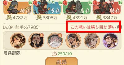 討伐をタップしたあと、「この戦いは勝ち目が薄い」と表示されたら敗北する可能性が高いです。出兵はしないほうがいいでしょう。