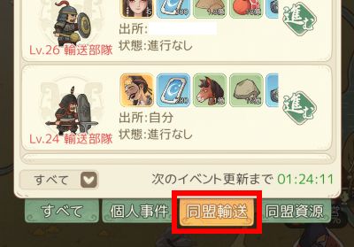 輸送部隊は偵察によって発見され、発見された輸送部隊は[事件]>[同盟輸送]で共有され、すべての同盟会員が倒せるようになります。