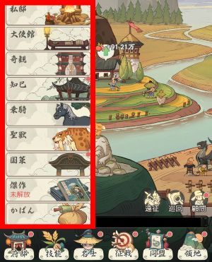 画面左下の[府邸]から移動できるところ(私邸や知己、乗騎など)でも繁栄度を上げることができます。