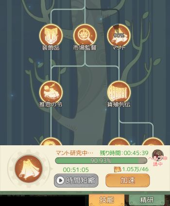 技能には、資源を消費して研究できる「技能」と、資源と天工の巻物を消費して研究する「精研」の2種類があります。