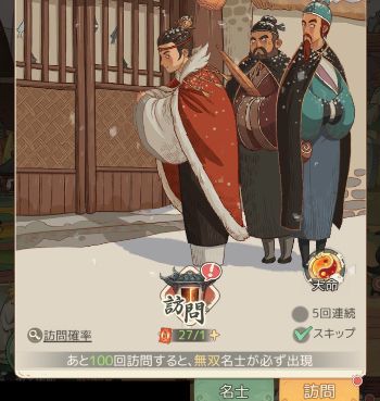 アイテム「訪問帖」を消費して名士を獲得できる。