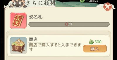 改名札を持っていない状態で[名前変更]をタップすると、自動的に購入画面が表示される。購入には500玉璧が必要。