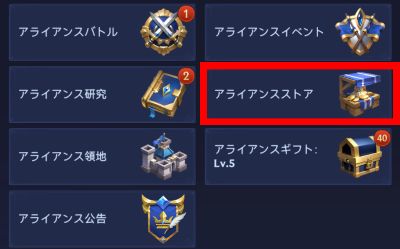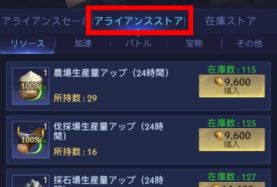 「アライアンスストア」にはリソース、加速、バトル、宝物、その他に関連したアイテムが売られています。