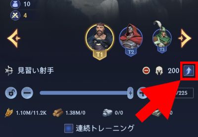 例)T3まで解放している場合、T1とT2の兵士をT3に昇進させることができます。