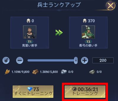 1. 「兵士ランクアップ」という画面が出るので昇進させたい数を決めたら[トレーニング]をタップ。