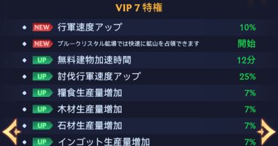 VIPレベルが上がると、新たな機能が追加されたり、リソース生産量が増えたりなど、ゲームの進行がちょっとラクになる特典が得られます。