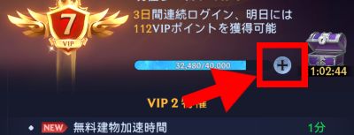 - 画面左上の[VIP]>宝箱の左にある[+]>VIPポイント100ptを[使用]
