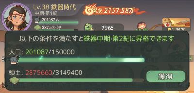 例えば、鉄器時代前期の場合はLv37が上限となっており、それ以上にレベルを上げたいのなら先に時代を昇格する必要があります。