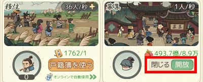 • 戸籍簿を使うと食料の消費なしで人口を増やすことができます。戸籍簿1つで200人が増えます。