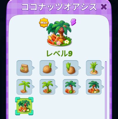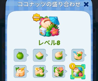ココナッツの盛り合わせは、数回タップするとスポーンしなくなり、レベル5のココナッツになってしまいます。なので、キャンディが足りないときは、またココナッツの木からココナッツの盛り合わせを作るところから始めなければなりません。